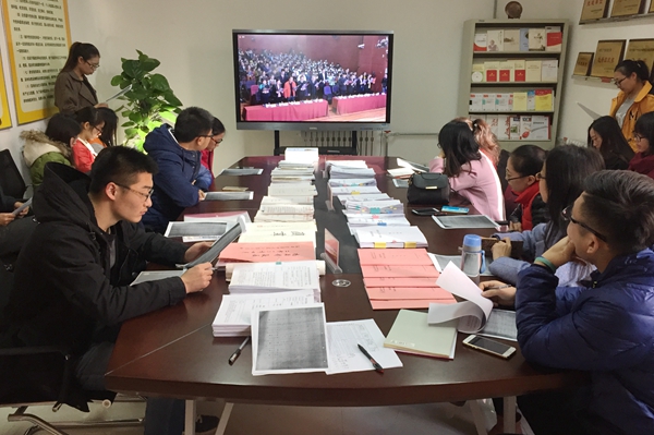 晨读后,各支部研究生在学院党员活动室统一观看教育部举行的国家宪法日暨教育系统宪法学习日现场活动的视频。当听到专门为宪法日创作的歌曲《宪法伴我们成长》,不少同学表示其实宪法就在我们生活的点滴中,研究生203党支部书记说:“宪法虽然很薄,但却很沉。宪法精神的内在价值是以人为本,这也是构建和谐社会的重要标志,是推进‘全面建设小康社会、全面依法治国、全面从严治党、全面深化改革’战略布局的重要保障。”206支部付倩在观看苗族初中姑娘赵小庆演讲后,“真切的感觉到宪法贴近人民,给少数民族同胞带来真真切切实实在在的好处”。观看了来自香港皇仁书院两名学生的演讲后,204支部的王兴梅说,港台同胞也一心期望祖国的统一与强大,港独不是每个香港人的意愿。一切港独分子终将受到法律的制裁。“只有祖国统一,民族团结,才会真正实现国家富强,民族振兴,人名幸福的中国梦”。(赵倩茹 郭璋 屈阳)