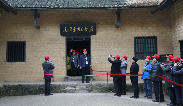 校友们在韶山毛泽东广场向毛泽东铜像敬献花篮