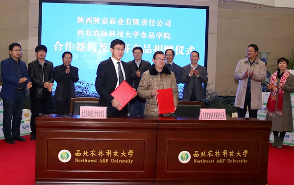 在捐赠仪式上,陕富面业和我校食品学院签订了教学实习基地、学生就业实习基地和产学研合作三份协议,开展全方位合作,并准备在双方筹办“小麦加工产业技术研究院”和“食物营养与健康研究院”的过程中实现资源共享。