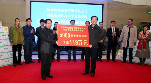 每一千斤“西农979”等优质小麦可提取一斤小麦胚芽粉。小麦胚芽粉成为校企合作的新成果,也成为陕富集团事业新的生长点。为感谢学校的科技支持,陕富面业为我校共捐赠价值119万元的5000罐(盒)小麦胚芽粉产品。陕富面业总经理郭进安表示,“希望这些产品能给西北农林科技大学教职工带去我们的新年祝福”。
