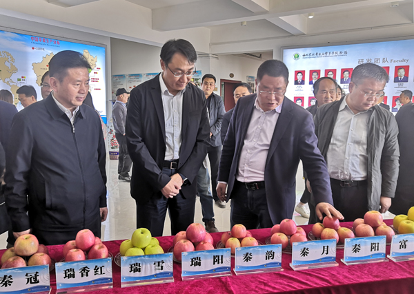 赵岩考察了试验站苹果种质资源圃、杂交育种圃、脱毒品种保存圃以及瑞雪瑞阳新品种展示园、不同栽培模式试验园和乔化果园更新改造技术示范等,品鉴了试验站近年培育的苹果新品种,听取了试验站首席专家赵政阳教授有关情况介绍,以及翟丙年、李会科等驻站专家近期研究进展情况汇报。