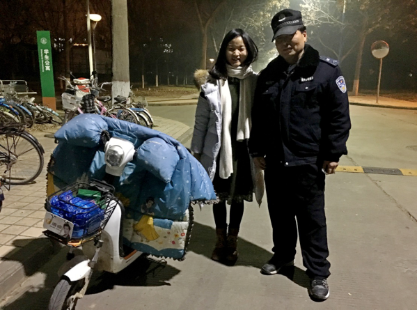 新年第一天的下午5点,我突然反应过来昨晚忘记给电动车上锁了,于是火速冲下宿舍楼,电动车果然不见了。当我无比懊恼地去保卫处警务室报案时,还闪过一丝念头,会不会保安大叔看见我的车没锁,替我保管起来呢?当我抱着一丝希望来到南校区警务室门口时,一抹熟悉的蓝色映入我的眼帘?果然是我的爱车,被好心的保安大叔“收留”了。