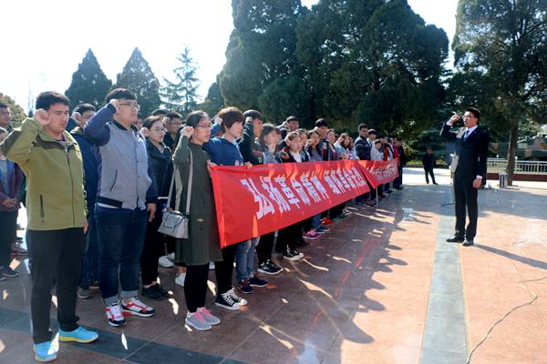 烈士纪念碑前,全体学员列队整齐,在庄严的国歌声中,向革命烈士们郑重地三鞠躬,表达自己由衷的敬佩与缅怀之情。苍松翠柏掩映下的党旗迎风飘展,全体党员庄严肃穆,重温入党誓词,不忘初心,报效祖国。经济管理学院的尹雪莹代表全体青马大骨班同学发言,“作为学生,我们要努力学习国史党史,立足实践,在实践中贯彻社会主义核心价值观。立足专业,做好榜样,学好专业知识。争取做一个有理想、有追求、有担当、有品质,有作为,有修养的六有青年。”