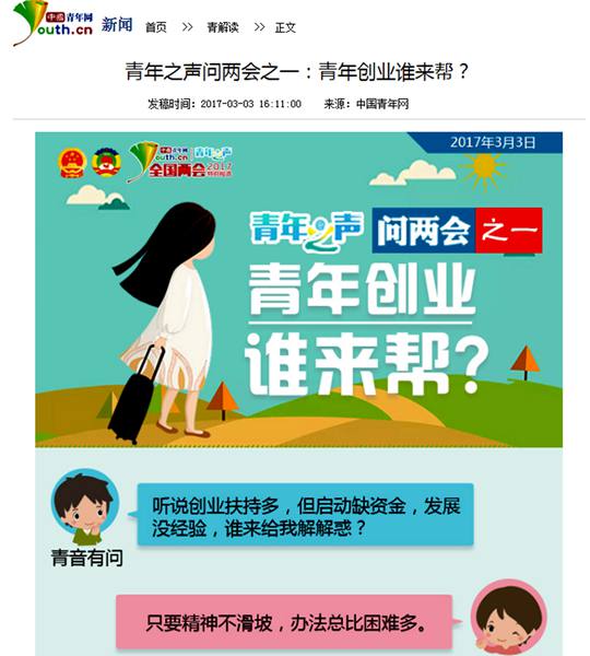 《青年创业谁来帮》包含青年创业啥现状、青年创业怎么帮、代表委员怎么说三部分内容。在图表小组工作人员的指导下,他们对作品不断修改、几易其稿,最终获得中国青年网指导老师的认可。《“青年之声”问两会》系列图标共32个,而他们的作品也成为该系列的首发。