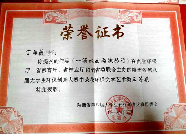 近日,我校学子在陕西省第八届大学生环保创意大赛上斩获三个奖项。其中丁雨薇同学的作品《一滴水的两次旅行》获得文学类作品三等奖、《夏眠》获得文学类作品优秀奖,由董力玮、张洁、崔释心等同学共同拍摄完成的微电影《如果一天只有一壶水,你怎么用?》获得影像类作品优秀奖。