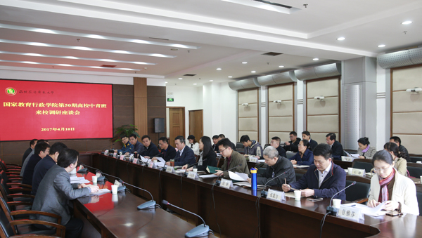 4月10日,国家教育行政学院第50期高校中青班32人来校调研我校产学研合作与社会服务创新等工作,在实地参观了我校农业科技推广展室后,在210会议室与常务副校长吴普特等进行了座谈。
