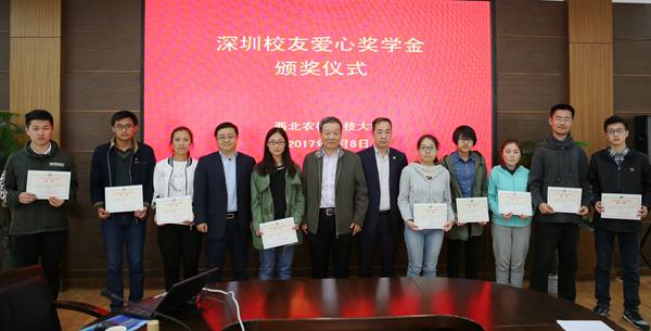 深圳校友爱心奖学金由我校深圳校友会于2016年捐赠40万元设立,旨在鼓励和帮助品学兼优的家庭经济困难学生顺利完成学业。每年深圳校友会组织深圳校友通过公益捐赠10万元奖励20名本科生,每人奖励5000元。获奖学生代表、食品学院张倩同学表示将学习校友们敢闯敢拼的精神和大爱之心,并将其发扬光大。