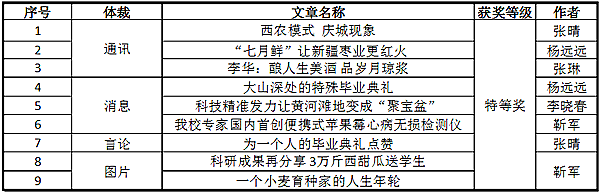 另有《信息学院教师探索实施课程期末考试成绩多元化考核》等5件作品获一等奖,学生记者闫克念的《跨文化交际:唤醒你的文化认同感》,王萍、王心怡、薛维的《少年大学生付尧:因为大爱报西农》和屈阳的《米敉佳:平凡世界书写不平凡的人生》等5篇作品获二等奖。
