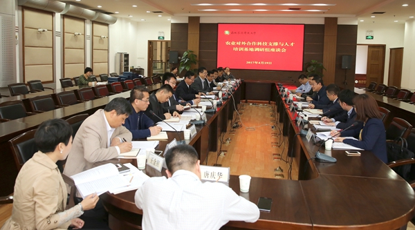 4月19日上午,农业部对外合作办副主任、外经中心主任杨易一行7人来校调研考察农业对外合作科技支撑与人才培训基地建设情况,并与学校有关部门、学院及示范区国际合作局负责人进行座谈,校长孙其信出席会议并讲话。