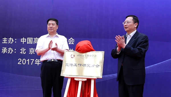 中国高等教育学会会长瞿振元和北京交通大学党委书记曹国永为宣传工作研究分会揭牌