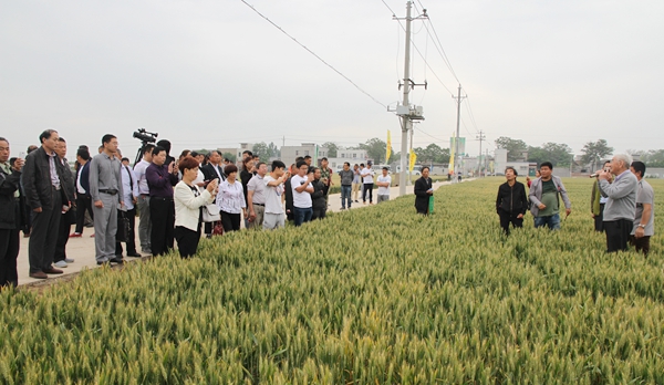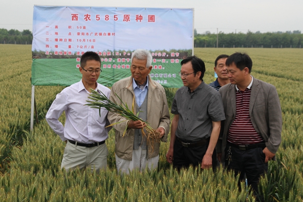 我校王辉教授继“西农979”之后,选育的又一个优质、高产、早熟、多抗小麦新品种“西农585”即将大面积推广。5月15日,由我校与河南金粒种业有限公司联合举办的优质强筋小麦新品种“西农585”现场观摩研讨会在河南省荥阳市举行。“西农585”育种人王辉教授及其育种团队、豫粮集团,以及来自河南、安徽、江苏、湖北有关县市种子代理经销商、种粮大户、家庭农场负责人等300多名代表参加了观摩研讨。