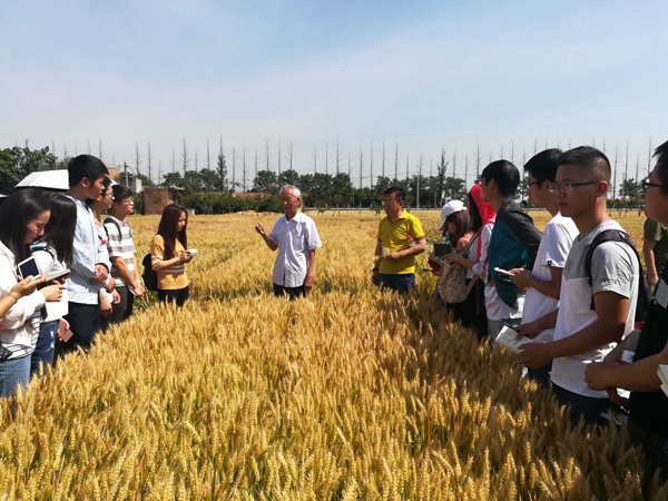 育种田中领会育种家谆谆教导。在户县陕西省农作物试验站,负责人宁江权老师对小麦区域试验和生产试验进行详细讲解,并带领学生对小麦品种和小麦病害进行了现场观察和解析。期间同学们遇见了著名小麦育种家赵瑜教授。赵教授在小麦试验田栉风沐雨50年,育成小麦良种5个,累计推广面积达6000万亩。他对学生进行了现场技术指导并谆谆教导到:“育种是一项辛苦而甜蜜的伟大事业,一粒种子可以改变世界;人就像一粒种子,只要找到合适的土壤,就可以改变自己、绽放精彩、造福世界。”