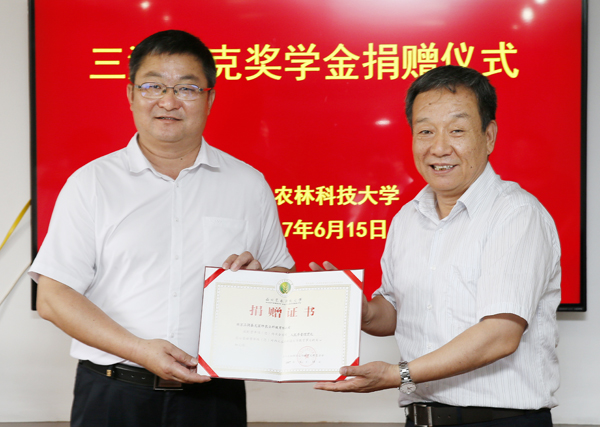 6月15日,“三润泰克奖学金”捐赠仪式在我校国际交流中心317室隆重举行。我校87级校友、北京三润泰克国际农业科技公司董事长吕科,董事会秘书、资本运营总监尹雪琴,技术总监龙智强,市场部项目经理邹凡,我校党委常务副书记、教育发展基金会理事长赵忠,陕西省设施农业工程中心主任、园艺学院邹志荣教授,教育发展基金会、园艺学院、学生处负责人和部分专家出席了捐赠仪式。