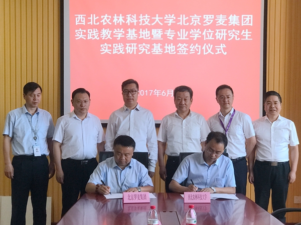 6月19日,西北农林科技大学-北京罗麦科技有限公司“实践教学基地和专业学位研究生实践研究基地”签字仪式在北京怀柔举行。校党委常务副书记赵忠出席签字仪式。北京罗麦日用品有限公司总经理马崧元与研究生院副院长杜永峰代表双方签署共建协议。