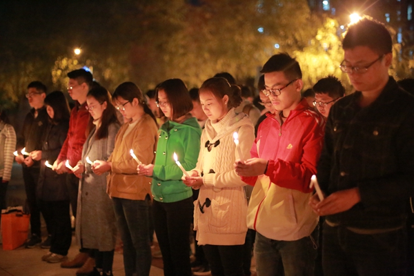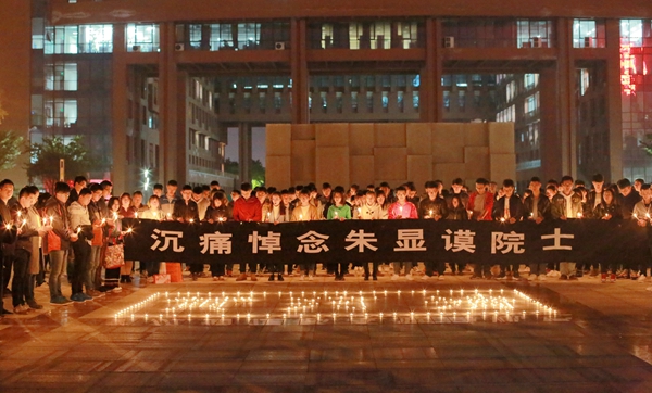12日当晚,南北校区的学生自发举行“烛光寄哀思”活动,近千名同学参与。活动以“追忆·悼念·缅怀·继承”为主题,大家集体学习朱显谟先生的主要先进事迹,用上百根蜡烛拼接形成“朱院士走好”“黄河清”,手持蜡烛,在“沉痛悼念朱显谟院士”的横幅前默哀肃立。“春蚕到死丝方尽,蜡炬成灰泪始干”,蜡烛燃起的“黄河清”闪闪发光,肃立,默哀,鞠躬,送别……