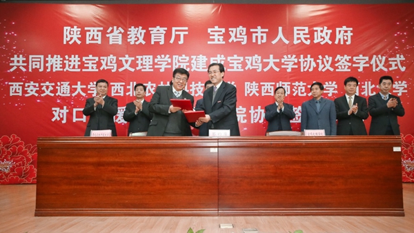 10月24日上午,陕西省教育厅、宝鸡市人民政府共同推进宝鸡文理学院建成宝鸡大学签约仪式在宝鸡文理学院举行。省教育厅厅长王建利,宝鸡市委书记徐启方、市长惠进才,我校常务副校长吴普特,西安交通大学校长助理洪军,陕西师范大学副校长冯旭东,西北大学党委副书记、副校长贾明德等出席签字仪式。