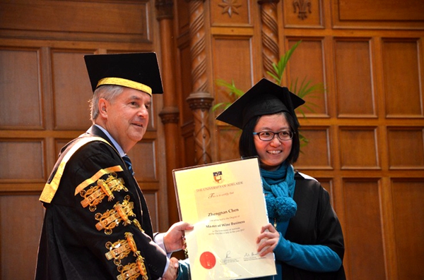 陈正楠,我校葡萄酒学院2012级葡萄与葡萄酒工程专业学生,于2015年9月赴澳大利亚阿德莱德大学攻读“3+2”葡萄酒商务硕士,以优异的成绩完成了葡萄酒商务硕士(2年制)所有课程,顺利获得阿大葡萄酒商务硕士学位证书。