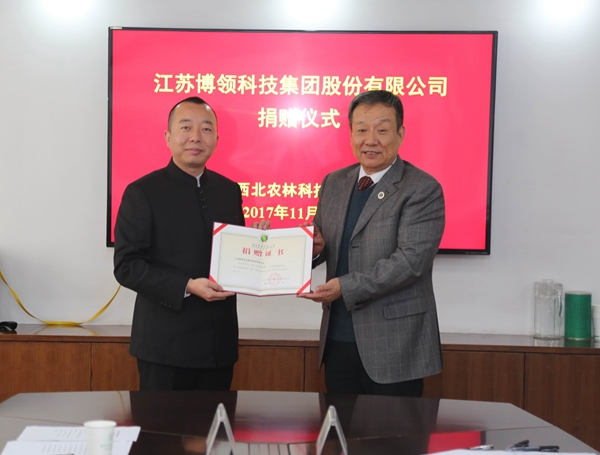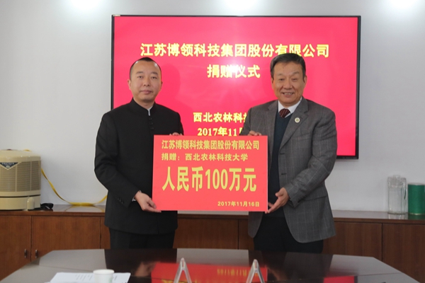 11月16日上午,江苏博领科技集团股份有限公司向我校捐赠100万元,用于奖励我校动物科技学院在科技创新与产业发展方面做出突出贡献的专家。捐赠仪式在交流中心317会议室举行。