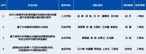 我校一直高度重视大学生科技创新工作,每年设立500万专项经费用于鼓励学生积极参与创新性训练,围绕农业科学特色,广泛培育学生科技创新项目。通过大学生创新创业论坛和“挑战杯”校内竞赛遴选优秀作品,以“校外专家专题指导与校内专家跟踪培养”相结合,形成了一批具有代表性的创新性项目,在各类科技创新竞赛中取得了一系列优异成绩。学校将以本次大赛为契机,进一步强化第二课堂人才培养工作,大力推进创新创业教育改革,不断提升拔尖创新人才培养的质量与成效。