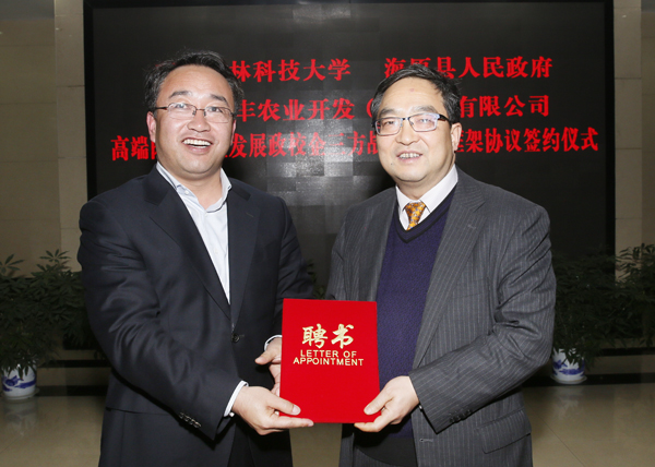 11月29日,我校与海原县人民政府、华润五丰农业开发(中国)有限公司在国际交流中心签署《高端肉牛产业发展政校企三方战略合作框架协议》,我校副校长钱永华、海原县副县长金钟河、华润五丰公司副总经理濮实分别代表校、县、企三方签署协议。中卫市委常委、海原县委书记徐海宁向昝林森教授颁发海原肉牛产业首席专家聘书。
