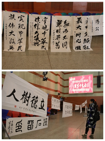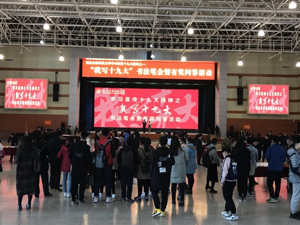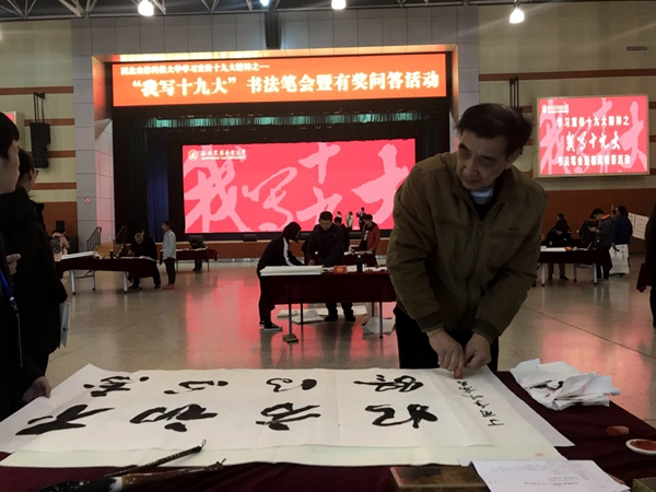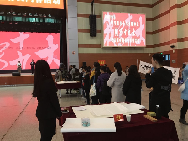 在全校师生深入学习宣传贯彻党的十九大精神之际,12月2号下午,由党委宣传部联合离退休职工党委、工会、团委共同举办的“我写十九大”书法笔会暨有奖问答活动在北绣山活动中心隆重举行,来自离退休职工、在职职工、学生近30名书法爱好者参加现场笔会,共书写书法作品600余幅。