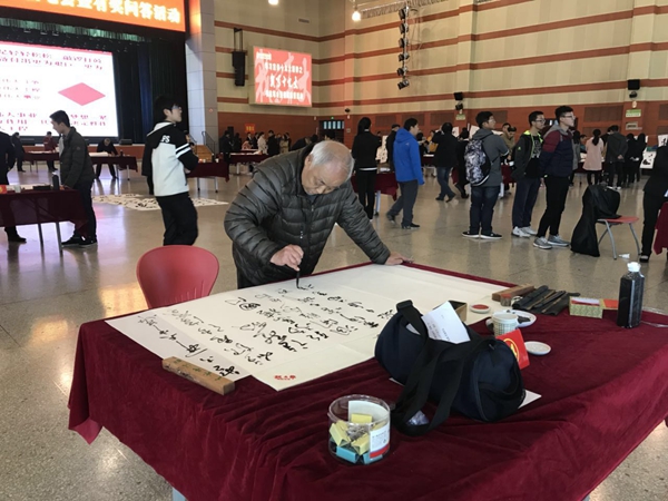 活动吸引了广大师生前往观摩学习,所有师生只要参与现场答题,答对者即可任选一幅书法作品。一位在现场服务的学生说到:“答题的同学络绎不绝,书写老师的热情高涨,我所服务的是一位年事已高的老前辈,我能从他们的身上学到传承的精神”。这种传承成为了他人生的信念,支撑他将教书和育人进行到底。活动已经结束了,可看着一位位同学渴望的表情,他的笔没有停下来。既然学生要,那我就多写一幅,也没有太大的关系,朴素的语言背后是老前辈的执着于追求。