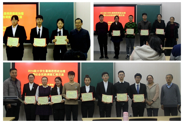 为了做好我校思想政治理论课实践课程的教学工作,坚持理论与实际相结合,注重发挥实践环节的育人功能,2017年暑期社会实践以“十八大以来这五年”为主题,37名指导教师认真指导,全校2016级全体本科生积极下基层,到农村、社区、厂矿、学校、市场等地开展了卓有成效的社会实践调查研究。按照教学环节,通过前三轮汇报交流,评选出优秀奖74名,三等奖26名,第三轮汇报交流前11名学生进行最后汇报交流。最终,肖劲男、丁晓蕾、陈曦荣获一等奖,林晨一、闫相伊、张宁涛、王洁琦、刘晨、路凯凯、陈英昕、钟睿获得二等奖。