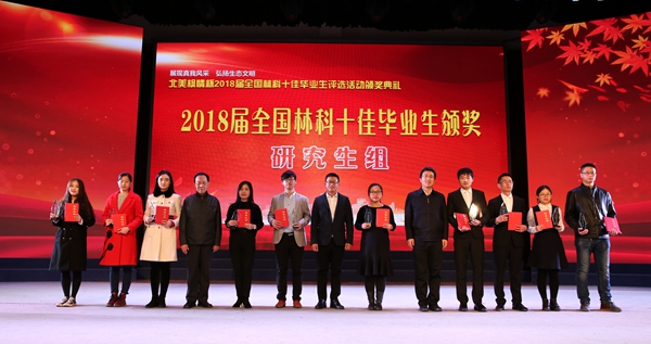 与会领导分别为研究生组、本科组、高职组2018届全国林科十佳毕业生,优秀毕业生代表,优秀组织单位和优秀组织个人颁奖。我校有12名同学获评相关奖项,其中资环学院曾全超获评研究生组十佳毕业生,经管学院娄佳宁获评本科组十佳毕业生;林学院刘姝彤、孙珊、唐庄生,水保所于卫洁,园林学院赵永青获评研究生组优秀毕业生;经管学院李薇,资环学院刘子雯,林学院徐瑾、岳晔,园林学院杨洋获评本科生组优秀毕业生。同时,我校荣获优秀组织单位,就业指导中心白金凤获评优秀组织个人。