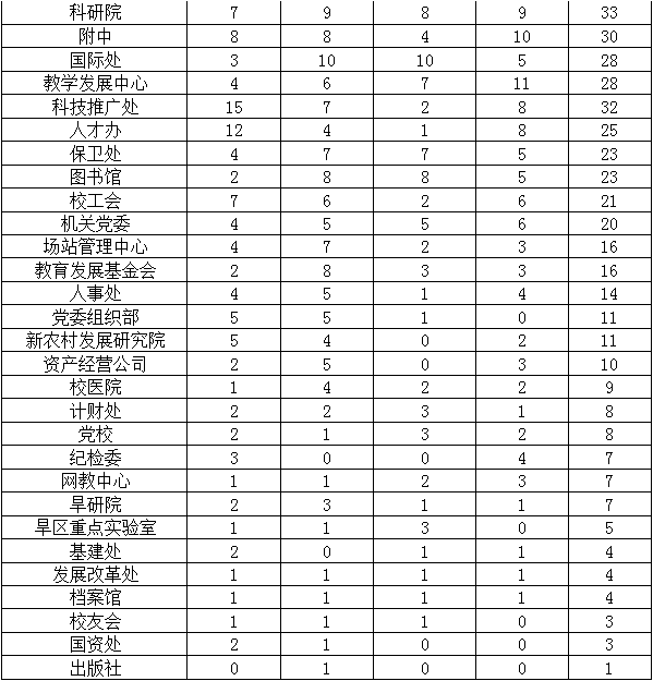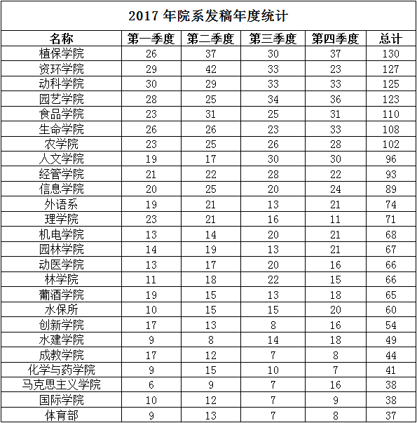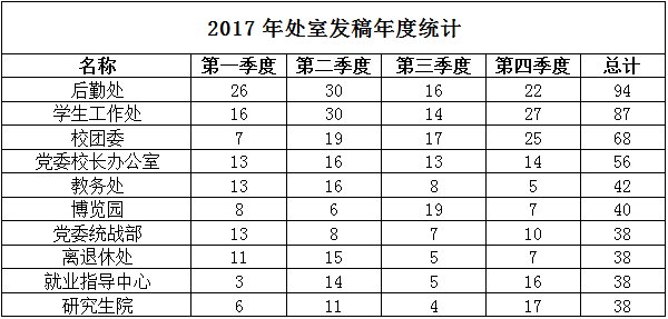 备注:1.所有统计数据以“新闻▪焦点”和“聚焦院处”两个栏目为准,日期为2016年11月30日—2017年11月30日; 2.统计标准为第一署名单位(含光荣榜内稿件来源); 3.表中未出现的单位稿件数量为0。