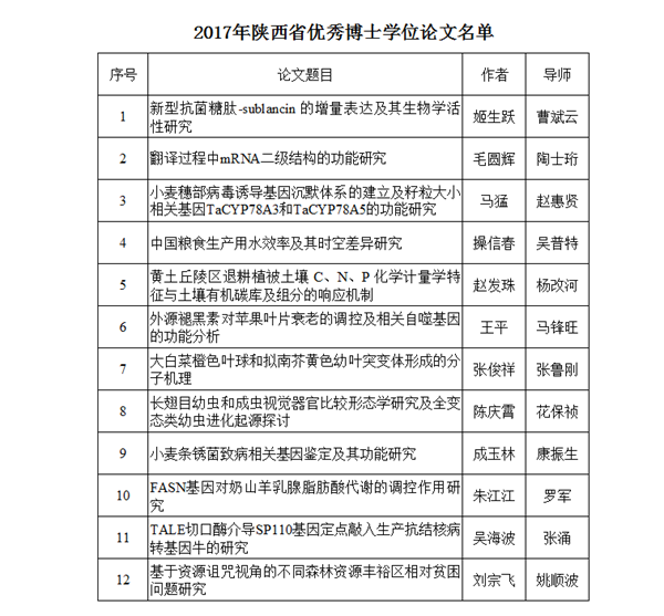 日前,2017年陕西省优秀博士学位论文评选结果揭晓,我校12篇博士论文获评“陕西省优秀博士学位论文”。