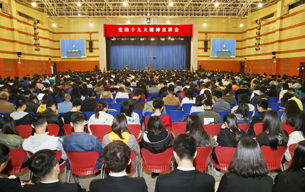 11月6日晚,校党委书记李兴旺在北绣山活动中心为1200余名学生骨干、青马工程学员、团学干部宣讲党的十九大精神,这是继10月26日为学校管理人员、教师代表等传达十九大精神后,为我校青年学生所作的专题报告。