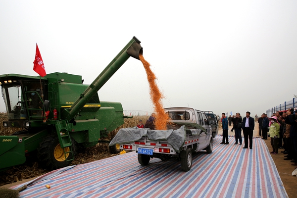 10月21日,在我校榆林玉米试验示范站,一台联合收割机正将金黄的玉米籽粒倾泻在地头的小卡车上。而当天的测产结果表明,我校薛吉全教授率领玉米科技团队选育的陕单636等多个玉米机收品种,不仅做到了籽粒直收,而且亩产均超过1000公斤,这也预示着我国玉米生产将进入一个新时代。