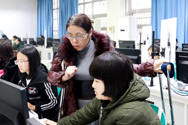 11月17日,发布寒潮蓝色预警的第一天。上午7:45,杨会君绑着腰围,拄着双拐,吃力地迈上只有几个台阶的数字媒体实验室,开始了忙碌的C语言指针、函数实习教学。这幕情景对于杨会君来说,只不过是她这一个多月教学工作中再普通不过的一个镜头。杨会君因腰椎间盘突出而做了手术,术后一周拄着拐杖重归课堂。
