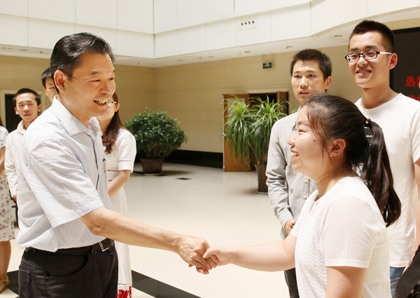 6月16日上午,学校在交流中心举行奔赴新疆、西藏2017届毕业生座谈欢送会。校党委书记李兴旺亲自欢送招录至新疆的严英子、李翔、王艳敏、聂运湾和招录至西藏的马丽君、王月、毋钊锋、杨卫红8名同学,勉励他们将青春汗水挥洒在天山南北和雪域高原,在祖国最需要的地方贡献力量。