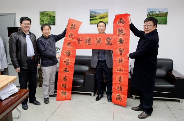 每到一处,吴普特为大家送上新春的祝福,询问了解近期工作情况、工作中存在的困难和问题。他还特意给康振生院士送了一副礼赞东南窑实验室的春联:“两院士智斗小麦锈病,数代人传唱西农精神”。