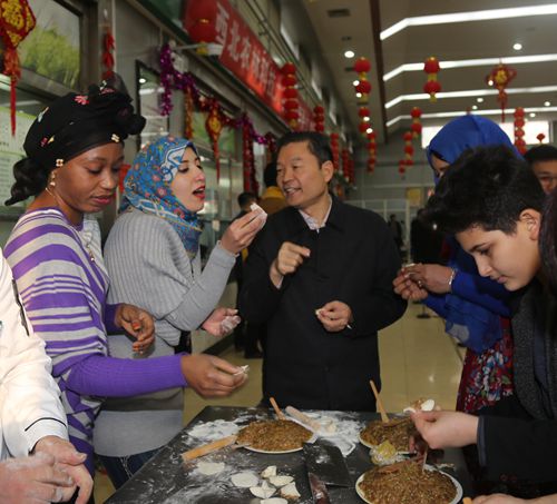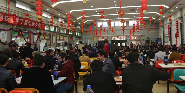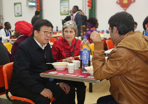 在南校区清真餐厅,李兴旺、吴普特与留校学生、外籍教师欢聚一堂共度除夕。