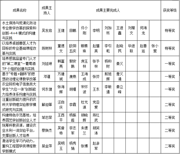 由资环学院吴发启教授主持的“水土保持与荒漠化防治专业教学改革的探索和创新-4+4模式的构建与实践”、动医学院陈树林教授主持的“以培养卓越兽医人才为目标的专业基础课程改革与实践”获特等奖,由葡萄酒学院刘延琳教授主持的“培养感官品鉴专门人才的“第二课堂”—葡萄酒TP小组的创建与实践”、马克思主义学院邓谨教授主持的基于“专题+翻转”的思想政治理论课教学改革”、机电学院何东健教授主持的“农业院校电子信息类大学生‘六位一体’创新能力培养体系构建与实践”获一等奖,由理学院解迎革副教授主持的“注重创新能力提升的农科大学物理实验教学模式研究与实践”、园艺学院邹志荣教授主持的“构建特色示范基地,培养园艺学创新创业人才”、水建学院蔡焕杰教授主持的“统筹科教资源,建设农业水利一流实验平台,支撑创新人才培养”、水建学院裴金萍副教授主持的“激活学生学习内动力,重构工程图学类课程教学新模式”获二等奖。