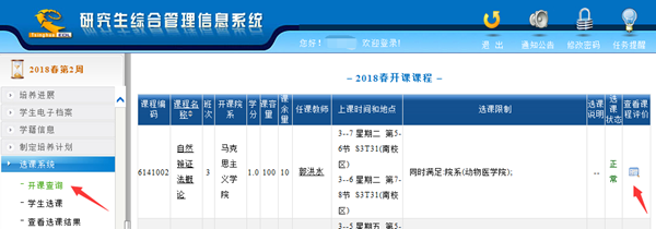 该功能以近2年研究生课程评价数据为基础,以“论坛”形式向全校研究生直观呈现以往修读研究生匿名对课程的客观评价。查看评价结果操作简单、直观。任课教师登陆“教育质量评价与督导系统”(账号、密码与登陆“系统”相同),进入“课程评价”,通过相应的评价项目,即可查看历年研究生匿名对该门课程的评价结果;研究生登陆“系统”后,进入“选课系统”,通过开课查询,即可查看以往修习研究生匿名对该课程授课的评价及有关建议。