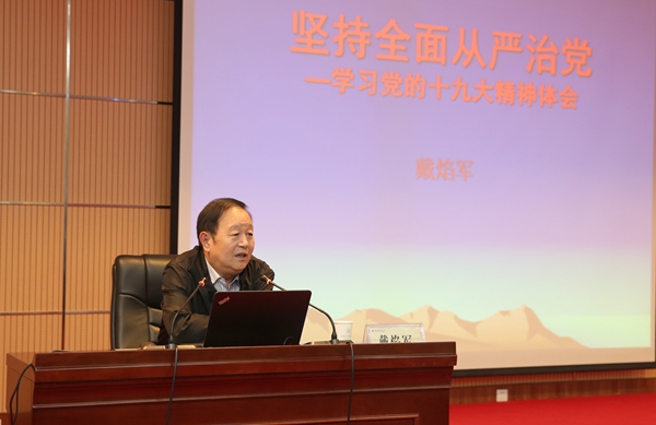 会上,戴焰军教授结合学习党的十九大精神,紧密联系当前实际,从坚持全面从严治党的重大意义、新时代全面从严治党总要求、当前全面从严治党重点任务等三个方面为我们做了全面讲解,系统阐述了当前为什么要坚持全面从严治党,怎样做到全面从严治党,如何在具体工作实践中贯彻全面从严治党等一系列重大问题。