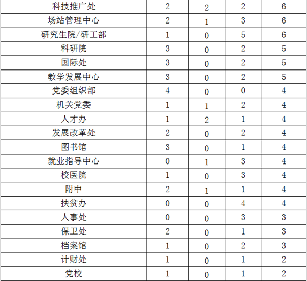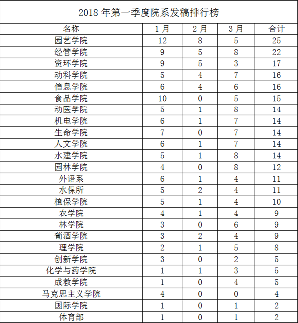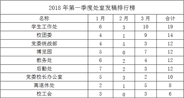 备注:1.所有统计数据以“新闻▪焦点”和“聚焦院处”两个栏目为准,日期为2018年1月1日—2018年3月31日; 2.统计标准为第一署名单位(含光荣榜内稿件来源); 3.表中未出现的单位稿件数量为0。