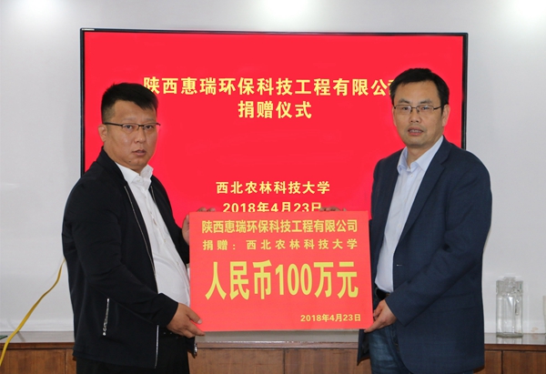 继2016年7月4日向我校捐赠100万元设立“陕西惠瑞环保土壤污染修复工程实验室”,4月23日,陕西惠瑞环保科技工程有限公司再次向我校捐赠100万元,用于资源环境学院惠瑞环保固体废物资源化处理实验室建设。副校长马建华代表学校接受捐赠并向其颁发证书,对企业的再次捐赠表示诚挚感谢。