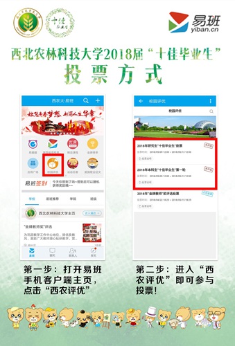 5月9日12:00至5月13日12:00,全校师生可使用实名认证的易班网账号登录易班手机客户端,在首页点击“西农评优”即可进入投票界面。