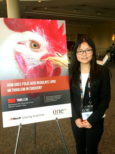刘艳利本次参赛的论文题目是:《基于蛋白组和代谢组技术研究叶酸对鸡原代肝细胞脂质代谢的影响》。刘艳利介绍,由脂代谢异常引起的腹脂沉积是家禽养殖过程中面临的严峻问题,与哺乳动物不同,家禽的脂代谢过程主要发生在肝脏中,多项研究表明叶酸与脂代谢调控有重要关系,该研究利用鸡原代肝细胞培养模型,探究叶酸调控家禽脂质代谢的分子机制,尝试为家禽日粮中合理调整叶酸含量提前预防腹脂沉积提供依据。
