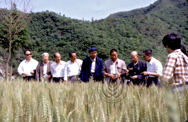 1987年,李晴祺(左一)与庄巧生院士(右三)、赵洪障院士(右四)等在湖北襄樊考察小麦品种。