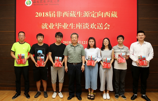 座谈会上,赵忠向西藏定向生赠送了《梁家河》等4本图书,勉励他们走上新工作岗位后继续践行“西农精神”,发扬“老西藏精神”,以当代优秀大学生的精神风貌承担起一份责任,以当代青年学子的社会担当和实际行动创造出无愧于青春的优秀业绩。13名2018届西藏定向毕业生踊跃发言,深情回顾了自己的大学生活,对党和国家的关心与培养表示真挚感谢,对母校和恩师的培养与关怀表示深深的感激。动科学院逯倩倩表示,要带着在母校学到的丰厚知识和技能,以饱满的热情投身到西藏的建设发展中去,将知识和技能转化为丰硕的果实,为西藏建设奉献力量。植保学院史晋洲表示:“我将以母校做为坚强的后盾,在雪域高原继续发扬‘西农精神’,奉献自己的光和热,不辜负母校和老师们的重托。”我校2008届西藏定向生蒋宏亮受邀返回母校参加座谈,他结合自己在西藏生活工作经历和切身体会,建议即将赴藏的定向生要尽快转变角色,放平心态、扎实工作、不忘学习,为祖国边疆的长治久安、经济社会发展贡献力量。