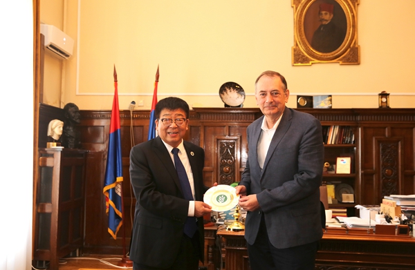 吴普特校长向贝尔格莱德大学校长赠送纪念品(靳军摄)