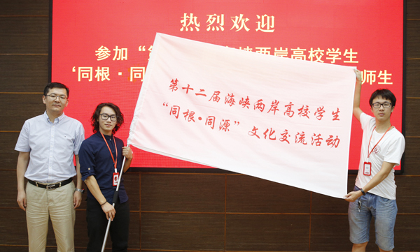 教务处副处长卢涛代表学校将第十二届海峡两岸高校学生“同根.同源”文化交流活动营旗授给两岸学生