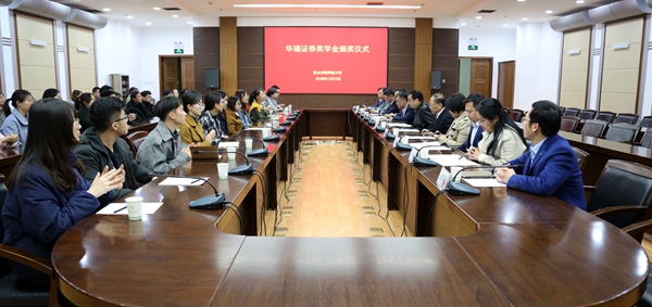11月12日晚,我校在交流中心210会议室举行2018-2019学年华福证券奖学金颁奖仪式。华福证券有限责任公司党委委员、监事会主席、纪委书记林强和我校副校长兼教育发展基金会副理事长马建华为40名获奖学生颁发证书。