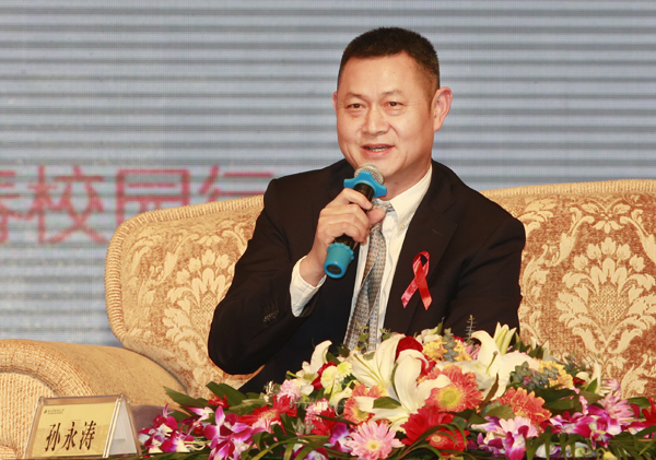 鞠萍、孙永涛、汪宁三位嘉宾与现场师生进行互动交流并讲解艾滋病防治知识