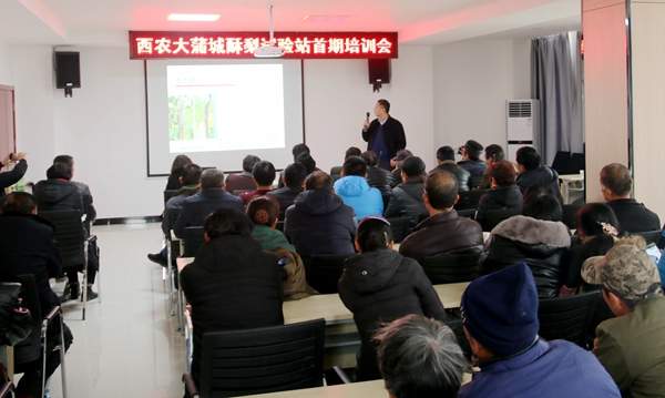 揭牌仪式后,试验示范站首席专家徐凌飞教授还对龙阳镇店子村、党睦镇孝东村等果业专业村的60多名果农进行了技术培训。